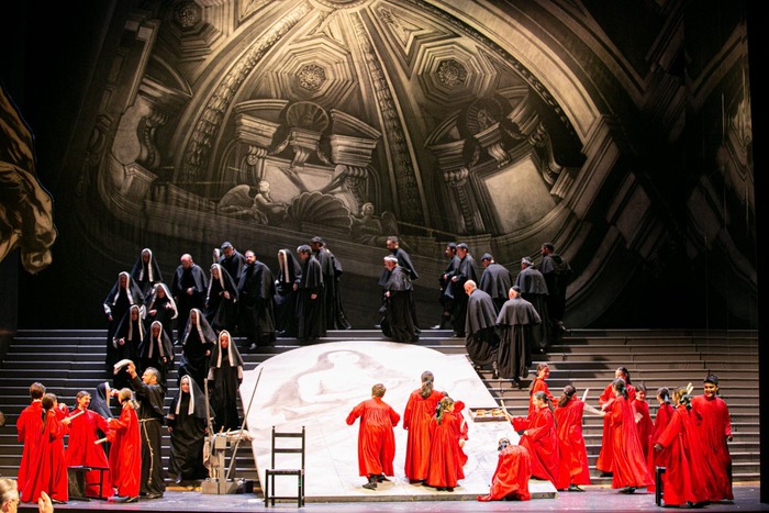 È un allestimento storico di Tosca quello in scena al Teatro Petruzzelli per la stagione lirica dell’omonima Fondazione, realizzato, da un’idea di Alberto Fassini, dal Teatro Regio di Parma nel 2009 con la regia di Joseph Franconi Lee, che aveva curato una prima edizione per il Comunale di Bologna nel 1999. Da allora questa ‘Tosca’ è stata presentata nei più importanti teatri del mondo. Stasera la direzione dell’orchestra era affidata ad Antonio Pirolli, che si alternerà sul podio con Alvise Casellati, come faranno del resto anche i protagonisti: al debutto l’opera è stata affidata al primo cast, con la soprano Svetla Vassileva, Giuseppe Gipali nei panni di Cavaradossi e Carlos Almaguer (Il Barone Scarpia), un trio “intriso di amore e morte in una storia che si presta facilmente al noir”, sottolinea Franconi Lee, americano di origini pugliesi che per il Petruzzelli negli ultimi anni ha curato diverse opere di Verdi. Il regista ha immaginato una Tosca diva del cinema e la fa scendere da una grande scalinata.