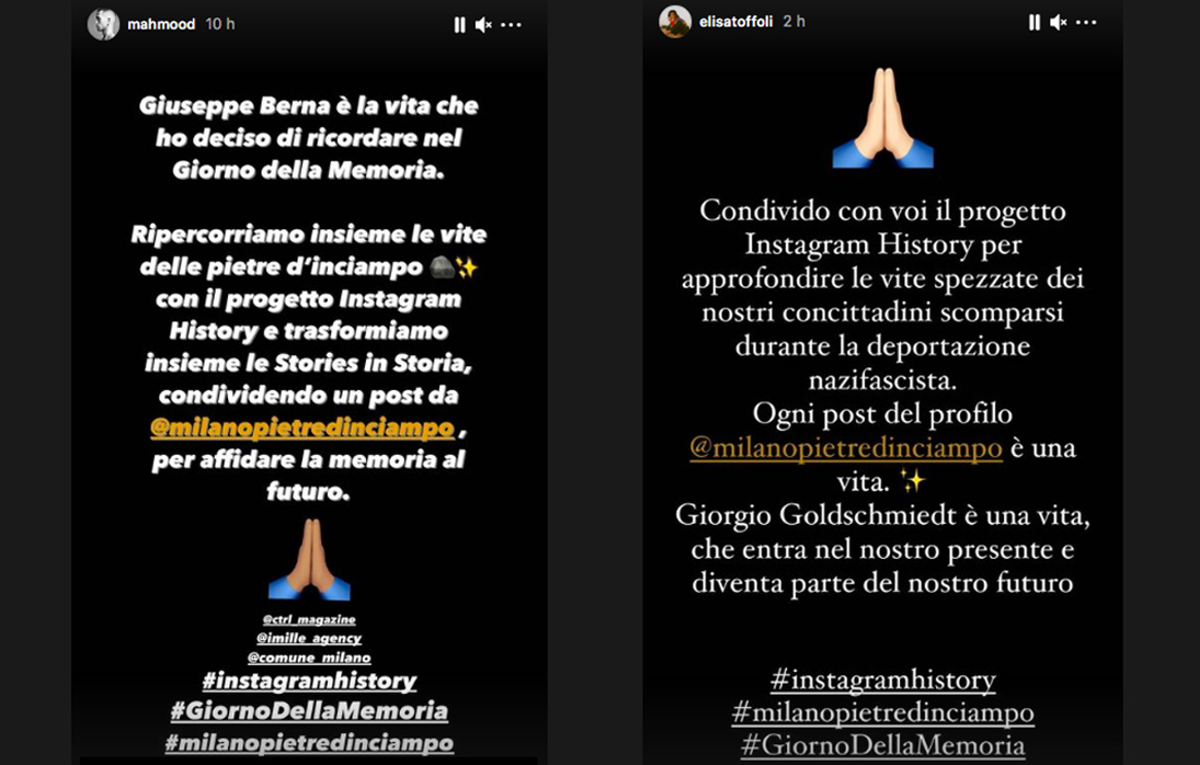 Oggi, mercoledì 27 gennaio 2021, per la giornata in ricordo della Shoah e dei milioni di vittime di uno dei più grandi genocidi della storia è stato lanciato un progetto molto interessante e in linea con i tempi. Parliamo di Instagram History, nato grazie alla collaborazione tra il Comitato Pietre d’Inciampo Milano, Imille e CTRL Magazine, con il patrocinio del Comune di Milano. In pratica, gli studenti degli istituti Galdus, Carlo Porta, Manzoni e Marconi hanno approfondito le vite spezzate dei loro concittadini scomparsi durante la deportazione nazifascista e le hanno portate nei nuovi mezzi di comunicazione, come se fossero delle ideali Pietre d’inciampo. In questo modo la Memoria ha trovato nuove vie, affinché certe cose non accadano mai più. Al progetto hanno aderito anche diversi personaggi famosi, fra cui alcuni cantanti come Elisa, Mahmood, Ministri, Selton, Ghemon e Noemi, che hanno realizzato delle storie Instagram per celebrare coloro che diedero la vita per la libertà. Elisa ha raccontato la vicenda umana di Giorgio Goldschmiedt, nato a Trieste il 10 marzo 1890 da Beniamino e Vittoria Schach. Jole Camerini nasce a Trieste il 10 gennaio 1894 da Isacco ed Elena Ancona. Entrambi triestini di cittadinanza italiana, nel 1914 prima dello scoppio della Grande Guerra si traferiscono a Milano. Dal matrimonio nel 1919 nasce un figlio, Sergio. Giorgio Goldschmiedt probabilmente a Milano è commerciante. Dopo l’emanazione delle leggi razziali del ’38, il figlio Sergio viene mandato a proseguire gli studi in Inghilterra e da qui nel 1940 emigra in Brasile presso gli zii materni. Nonostante le sollecitazioni dei parenti, i coniugi Goldschmiedt preferiscono rimanere in Italia. Dopo l’8 settembre si nascondono vicino a Varese, in casa dell’avvocato Albrighi, e tentano di passare in Svizzera affidandosi a contrabbandieri da cui vengono traditi. Sono arrestati a Luino il 10 dicembre 1943 e carcerati a San Vittore. Da qui con il “Trasporto 24” dal binario 21 della Stazione Centrale di Milano il 30 gennaio 1944 vengono deportati: destinazione Auschwitz. Mahmood, invece, si è concentrato sulla vita di Giuseppe Berna che nacque il 3 settembre 1903 a Balsamo da Luigi Berna e Teresa Virginia Melzi. Sposato con Maria Meroni, aveva due figli: Lino (4/10/1935) e Rosa (6/5/1943) e abitava a Milano in via privata Hermada 4. Svolgeva la professione di tracciatore alla I Sezione della Società Italiana Ernesto Breda per Costruzioni Meccaniche. Dopo l’8 settembre 1943 entrò nella 108^ Brigata Garibaldi S.A.P. Daniele Martelosio. Si occupava della propaganda tra i suoi compagni di lavoro e della diffusione della stampa clandestina. Fu, con Santo Bencich (anch’esso deportato e deceduto a Mauthausen), un animatore degli scioperi del 1943 e del 1944. La notte tra l’11 e il 12 marzo 1944 venne arrestato presso la sua abitazione per aver partecipato allo sciopero che, iniziato l’1 marzo 1944, per otto giorni aveva bloccato le più grandi fabbriche del Nord. Durante l’arresto alcune sue coinquiline opposero un’accanita resistenza per impedire che fosse portato via dalla moglie inferma e dai due figli di 8 anni e 10 mesi. Nella giornata del 12 marzo venne incarcerato a San Vittore Milano; il 13 marzo passò amministrativamente nel braccio tedesco dello stesso carcere. Venne in seguito condotto a Bergamo e rinchiuso nella Caserma Umberto I. Il 17 marzo 1944 fu caricato su vagoni piombati che partirono dalla stazione di Bergamo e giunsero a Mauthausen (Austria) il 20 marzo. Nel Lager gli venne assegnata la matricola 58709 e fu utilizzato come operaio specializzato nei diversi campi dove fu condotto. Essendo stato da giovane un bravo tenore (aveva cantato tra gli altri anche con Luciano Tajoli) e avendo fatto parte del coro del Teatro alla Scala di Milano con Aureliano Pertile, durante la prigionia veniva chiamato dai compagni il cantore triste. Il 24 marzo fu trasferito a Gusen, il 15/16 aprile a Wien Schwechat, l’11/15 luglio a Wien Floridsdorf (tutti sottocampi di Mauthausen). Infine, venne deportato nuovamente, in data non nota, a Mauthausen, dove morì per stenti il 10 maggio 1945 nel Blocco 5, riuscendo però a vedere la liberazione del campo. Fu sepolto nel cimitero dei soldati della cittadina di Mauthausen. I suoi resti furono identificati nel 1965 (numero di esumazione 1131) e ora una tomba non più anonima lo ricorda. Dopo la Liberazione gli venne riconosciuta la qualifica di partigiano operante con la 108^ Brigata Garibaldi S.A.P. (Squadre di Azione Patriottica) Daniele Martelosio dal 9/9/1943 all’11/3/1944, data del suo arresto. Oppure Noemi, che ha deciso di celebrare Emma Bovi, nata a Milano il 27 aprile 1888. In data 14 marzo 1911 sposa Paolo Farina, andando ad abitare in Via Sottocorno 19. Rimasta vedova il 2 settembre 1918, nel 1921 sposa Enrico Pizzutti, già padre di due figli, Piero e Sandra, con il quale stabilisce la residenza in Via Bezzecca 1. Non si conosce praticamente nulla della sua attività di antifascista. In un biglietto da Fossoli di Mino Steiner si legge: “quanto all’Emma (che si chiama Pizzutti) si è comportata benissimo, poteva compromettere molta altra gente”. Arrestata il 15 marzo 1944, è condotta a San Vittore, reparto SS tedesche, dove è immatricolata con il numero 1681, ma con il nome errato di Emma Bosien. Il 27 aprile 1944 è deportata a Fossoli e da qui, con il trasporto n. 70 partito da Verona il 2 agosto 1944, a Fürstenberg (Ravensbrück), dove viene immatricolata con il numero 49570. Muore in data 25 marzo 1945.