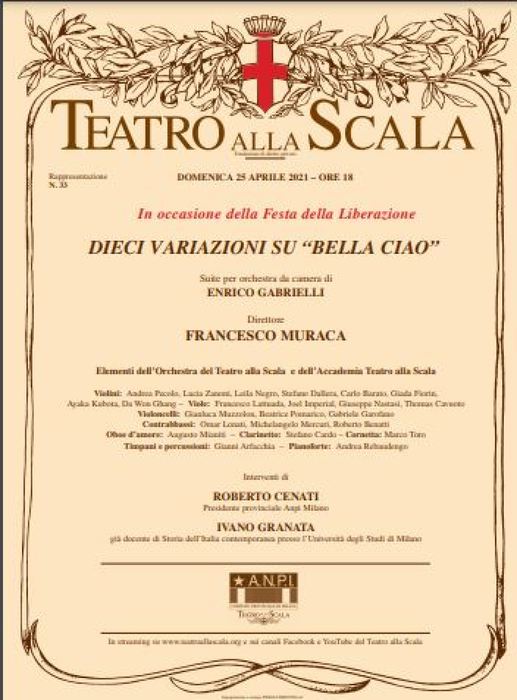 Il 25 aprile, giorno della liberazione di Milano, alla Scala, o meglio sui social del teatro, risuoneranno ‘dieci variazioni su Bella ciao’. Si tratta di una suite che la sezione Anpi del teatro ha commissionato a Enrico Gabrielli, compositore con un passato negli Afterhours e collaborazioni prestigiose nella musica di generi diversi. L’esecuzione della suite per orchestra da camera (con archi, tre fiati, percussioni e pianoforte), diretta da Francesco Moraca – che è anche professore dell’orchestra scaligera – sarà preceduta da un saluto del presidente milanese dell’Anpi Roberto Cenati e da una lectio sul ruolo di Milano nella Liberazione di Ivano Granata, che ha insegnato storia dell’Italia contemporanea alla Statale. L’esecuzione da parte di componenti dell’Orchestra del Teatro, affiancati da giovani dell’Accademia, della Suite in dieci movimenti sul tema di Bella Ciao è stata registrata nei giorni scorsi al Piermarini. Ed è il modo in cui il teatro, “per mezzo della sua Sezione Anpi, omaggia Milano celebrando il giorno in cui, partendo dalle sue strade, l’Italia si è liberata dal nazifascismo e ha riacquistato la sua libertà” spiega il presidente della sezione Francesco Lattuada.