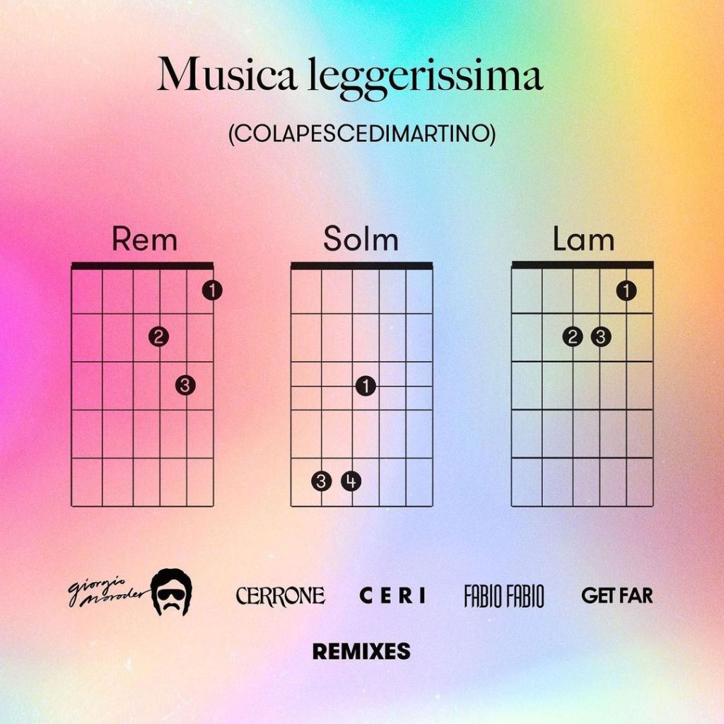 Un mese fa c’è stato il remix di Musica leggerissima fatto da Cerrone. «Le hit» ci diceva il guru della disco «vengono fuori quando quando i testi e la musica si incontrano e parlano alla comunità». Quella rivisitazione del pezzo farà parte di un EP contenente cinque remix della canzone portata a Sanremo da Colapesce e Dimartino. Dopo Cerrone, si sono cimentati con Musica leggerissima anche Giorgio Moroder, Ceri, Fabio Fabio e Get Far. L’EP uscirà a mezzanotte in digitale e in futuro anche in vinile. «Questa canzone ha smesso di essere nostra un minuto dopo la fine della nostra prima esibizione a Sanremo», scrivono Colapesce e Dimartino sui social. «In questi mesi ha risuonato ovunque: dalle case popolari agli stadi senza pubblico, dentro ai supermercati e parodiata in varie declinazioni». «Per festeggiarla abbiamo deciso di assegnare la canzone a cinque esponenti della musica da club: la leggenda assoluta quasi mitologica di Giorgio Moroder, il padre del French touch Cerrone, l’edonismo anni ’90 di Get Far aka Mario Fargetta, Ceri uno dei nuovi produttori italiani che molto ci piace e Fabio Fabio direttamente dal collettivo Iveatronic a rappresentare l’underground italiano. Esce a mezzanotte in tutti gli store digitali e presto arriverà anche una chicca per gli amanti del vinile».