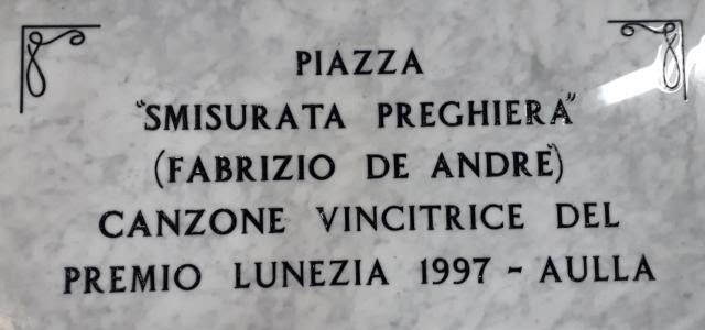 Si tratta di Piazza “Smisurata preghiera” (Fabrizio De André), nuovo spazio urbano che il Sindaco di Aulla e il Patron del Premio Lunezia inaugureranno con la partecipazione e l’entusiasmo del mondo della musica leggera italiana. L’evento cade nella ricorrenza dei 25 anni del Premio Lunezia, rassegna che proprio Fabrizio De André e Fernanda Pivano tennero a battesimo ad Aulla nel 1997, anno in cui la bellissima “Smisurata preghiera” vinse il Premio Lunezia.