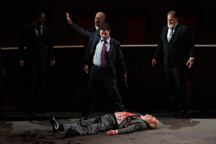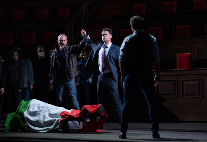 La tensione continua e incalzante, generata dal flusso musicale magmatico di Giorgio Battistelli e una messa in scena potente pensata dal regista Robert Carsen hanno reso trionfale l’apertura di stagione 2021-2022 dell’Opera di Roma con la tragedia ”Julius Caesar”. Il pubblico che il 20 novembre ha gremito il Teatro Costanzi per questa prima assoluta del lavoro commissionato espressamente al compositore romano su libretto in inglese di Ian Burton si è lasciato conquistare dalle strutture nervose e complesse di una musica contemporanea lontana anni luce dalla cantabilità dei titoli tradizionali del melodramma. L’orchestra dell’Opera di Roma, guidata da Daniele Gatti, al suo addio dopo tre anni da direttore musicale, e il coro hanno offerto una prova notevole. In platea, anche il neo sindaco di Roma Roberto Gualtieri, presidente della Fondazione Teatro dell’Opera. Ai grandi meriti di Battistelli, Leone d’Oro alla carriera, che ha costruito una rete sonora avvolgente e solida con squarci improvvisi enfatizzati dalle percussioni e dagli ottoni, si è affiancato l’allestimento studiato dal regista canadese. Carsen ha ambientato nella Roma di oggi la vicenda che ricalca il capolavoro di Shakespeare. Il tempio della politica dell’Urbe lascia il posto agli scranni di un Senato dei nostri giorni tra i quali si muovono personaggi in giacca, cravatta e valigetta. È così che i moderni Cassio e Bruto, temendo la tirannide, decidono il piano per eliminare Giulio Cesare, proprio quando il popolo vuole che sia proclamato re. Al termine il pubblico ha premiato tutti con lunghi applausi e battito di piedi che hanno sovrastato qualche sparuto ‘buu’ dai loggioni. Omaggio particolare per il compositore salito sul palcoscenico con Carsen e Gatti. Molti apprezzamenti per il cast, quasi tutto di madre lingua inglese: Clive Bayley (Julius Caesar), Elliot Madore (Brutus), Julian Hubbard (Cassius), Ruxandra Donose (Calpurnia, unico ruolo femminile), Dominic Sedgwick (Antony), Michael Scott (Casca), Hugo Hymas (Lucius), le scene di Radu Boruzescu, i costumi di Leon Carvalho, le luci di Peter Van Praet e dello stesso Carsen.