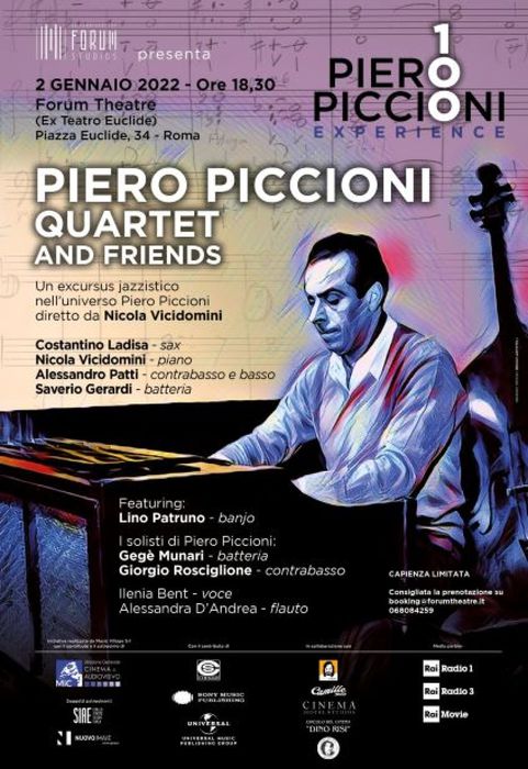 Un viaggio nel mondo musicale di Piero Piccioni, autore di brani e colonne sonore che hanno segnato la storia del cinema italiano. A proporlo domenica 2 gennaio a Roma sul palco del Forum Theatre, dove hanno sede i mitici Forum Studios in cui state registrate molte pietre miliari della musica, è il Piero Piccioni Quartet and Friends, ensemble guidato al pianoforte dal compositore, performer e umorista Nicola Vicidomini, con la partecipazione straordinaria del jazzista Lino Patruno al banjo e dei solisti storici di Piccioni Gegè Munari alla batteria e Giorgio Rosciglione al contrabasso. Creato da Vicidomini in occasione della mostra ”Piero Piccioni 100 Experience” inaugurata lo scorso 6 dicembre nel centenario della nascita del maestro, il quartetto è composto da Costantino Ladisa al sax, Alessandro Patti al contrabasso e basso elettrico e Saverio Gerardi alla batteria e percussioni. Sul palco con loro saliranno anche Alessandra D’Andrea al flauto, Gianpiero Cristaldi alla tromba, Dario Rosciglione al basso, Lucio Turco alla batteria e Ilenia Bent al microfono. Il concerto proporrà un excursus sulla lunga attività del compositore attraverso l’esecuzione dei brani jazzistici e delle composizioni romantiche e l’esplorazione delle sonorità swing e bossa nova fino ad approdare al funky più cool. In scaletta titoli indimenticabili come ”You never told me” dalla colonna sonora di Fumo di Londra, ”Give love a chance” da Il dio sotto la pelle e il tema principale di Il comune senso del pudore, la celeberrima ”Marcia di Esculapio” de Il medico della Mutua ma anche creazioni originali in omaggio a Piccioni. La mostra, fino al 6 gennaio negli spazi del Forum Theatre – a cura dal figlio Jason Piccioni, musicista e produttore, Nicola Vicidomini e Marco Patrignani, produttore e Ceo dei Forum Studios – propone oltre 150 fra manifesti cinematografici d’epoca, bozzetti originali, locandine e fotobuste, circa 200 dischi originali in 33 e 45 giri, più di 500 registrazioni master, fotografie e proiezioni.