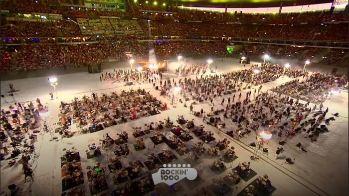 L’abbraccio collettivo di oltre 50 mila persone allo Stade de France che, ieri, a tre anni di distanza, ha ritrovato Rockin’1000 – la rock band più grande al mondo – per l’Eurovision Song Contest. Un concerto di due ore che è stato occasione per lanciare messaggi di pace, rispetto e uguaglianza. A colpi di rullante, “power chords” e grancassa, “le uniche bombe che è lecito lanciare”. Un’esperienza unica per 1.088 musicisti da 25 Paesi entrati in scena divisi per strumento: 166 bassisti, 216 batteristi, 359 chitarristi, 109 tastieristi e 238 cantati disposti sul campo che fra due settimane ospiterà la finale di Champions League. Tra loro anche tre abruzzesi, il chitarrista Vincenzo De Sanctis e il tastierista Angelo Violante, entrambi di Popoli (Pescara), oltre all’Aquilano Fabio Iuliano, impegnato alle voci. Maestro di cerimonia il giornalista Philippe Manoeuvre, un’icona del rock in Francia. A dirigere l’orchestra, Alex Deschamps. Proprio quest’ultimo ha passato il microfono a Fabio Zaffagnini, patron di Rockin’1000 sulle note di Won’t Get Fooled Again degli Who. “Siamo qui per suonare e abbracciarci. Non vedevamo l’ora dopo questo tempo difficile”, dice rivolto verso il pubblico. Più o meno alla stessa ora, in contemporanea sugli schermi di tutta Europa, scorrevano le immagini di Give Peace a Chance registrata a Torino qualche settimana fa, proprio dai musicisti di Rockin’1000. Anche il palco di Parigi è stato occasione per un messaggio di pace: “Non possiamo restare indifferenti di fronte a questa guerra – ha detto Zaffagnini. Ma non abbiamo armi da mandare. La nostra sola arma è la musica: abbiamo granate che escono dalle nostre grancasse e missili che vengono fuori dai nostri amplificatori”. Tra gli ospiti Richard Kolinka dei Téléphone e Matthieu Chedid “-M-“. In scaletta anche Lithium dei Nirvana e My Hero dei Foo Fighters dedicata a Taylor Hawkins, scomparso a fine marzo. “Un’emozione indescrivibile – ha commentato Vincenzo De Sanctis – avevamo bisogno di suonare insieme e dare il cinque alla gente sugli spalti”. Entusiasti anche i chitarristi Gianluca Diomedi e Pino Bitetti, compagni di spartito di De Sanctis. “Ci siamo lasciati travolgere da questa atmosfera unica”.