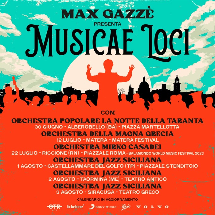 Spaziando dall’elettronica al sinfonico, dal synth-pop al prog e al rock, Max Gazzè da sempre coniuga l’anima avanguardistica e quella pop con grande disinvoltura. Ora il cantautore è pronto per un nuovo progetto che lo immergerà nei territori e nelle tradizioni di tutta Italia. Affiancato dalle Orchestre Popolari della penisola, Gazzè presenta “Musicae Loci”, un grande tour in cui in ogni tappa verrà accompagnato da una grande orchestra musicale del luogo, per portare sul palco le sue canzoni in una veste inedita che assorbirà colori e suoni tipici delle diverse zone in cui lo spettacolo verrà ospitato. Un progetto culturale legato al territorio, inteso non solo come area geografica ma soprattutto come terra di storia, musica e arte. Da l’Orchestra Popolare della Notte della Taranta a l’Orchestra Mirko Casadei, dall’Orchestra Magna Grecia a l’Orchestra Jazz Siciliana, ottoni e percussioni, tamburelli, organetti, violini e chitarre battenti si fonderanno con le sonorità di Gazzè per un concerto ogni volta diverso e spettacolare. Spaziando tra stili ed epoche diverse, dal repertorio classico al moderno, ogni live avrà una versatilità musicale particolare dove i ritmi colorati e ipnoticamente ripetitivi degli strumenti più tradizionali e delle percussioni si uniranno al background sonoro dell’artista. Così, in una commistione reciproca di note, con gli arrangiamenti curati da Max Dedo che sarà sul palco con Gazzè, le orchestre ridisegneranno con nuove sfumature i brani del cantautore e lui reinterpreterà alcune delle canzoni più rappresentative della tradizione locale. Queste le date: 30 giugno Alberobello con Orchestra Popolare La Notte della Taranta, 12 luglio Matera con Orchestra della Magna Grecia, 22 luglio Riccione (RN) con Orchestra Mirko Casadei, 1 agosto Castellammare del Golfo (TP) con Orchestra Jazz Siciliana, 2 agosto Taormina con Orchestra Jazz Siciliana, 3 agosto Siracusa con Orchestra Jazz Siciliana.